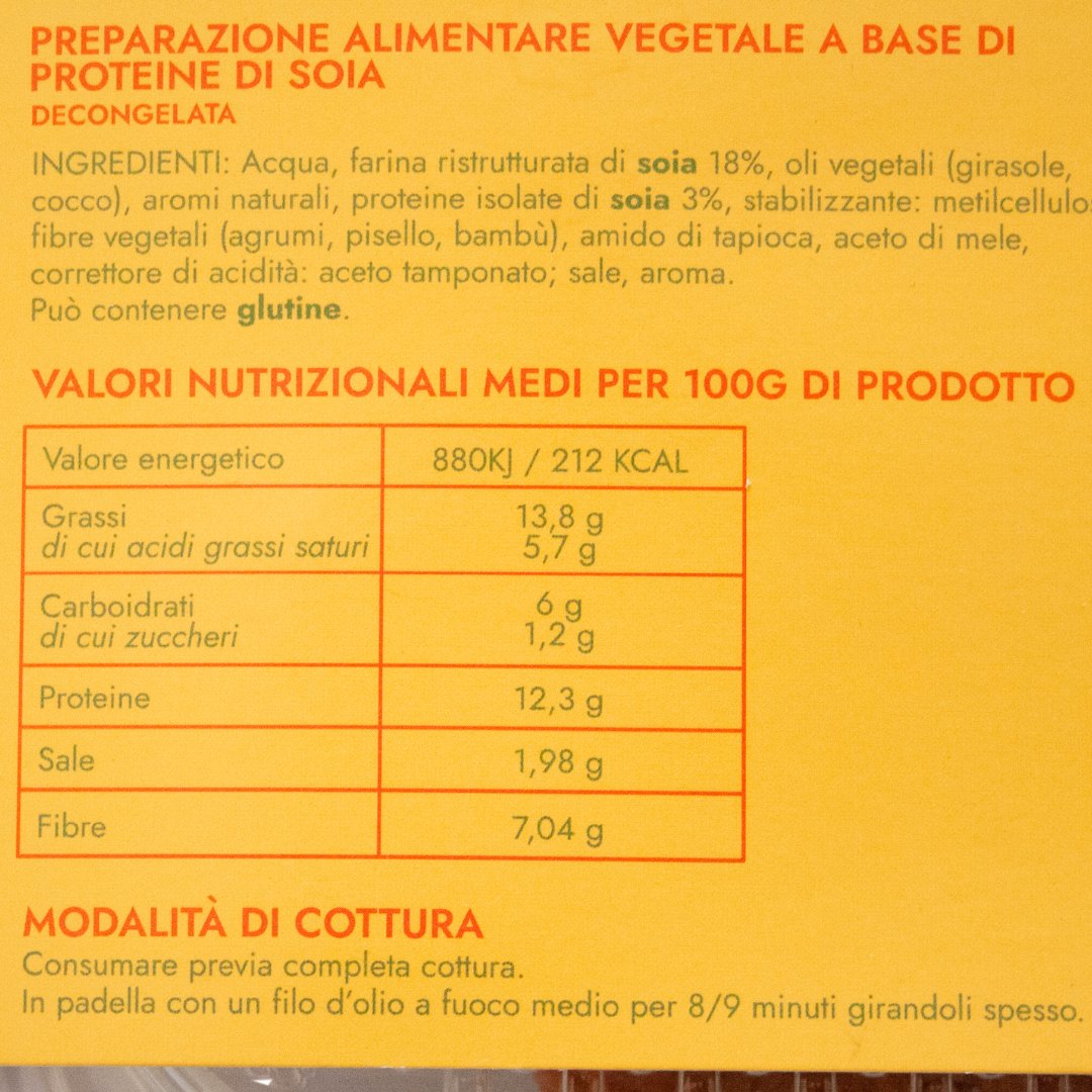 Acqua, farina ristrutturata di soia 18%, oli vegetali (girasole, cocco), aromi naturali, proteine isolate di soia, stabilizzante: metilcellulosa, fibra vegetale (agrumi, pisello, bambù), amido di tapioca, aceto di mele, correttore di acidità: aceto tamponato, sale, aroma.
